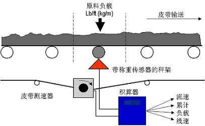 電子皮帶秤由稱重裝置、稱重傳感器、測速傳感器和稱重顯示器組合而成。電子皮帶秤稱重時,稱重裝置將皮帶上物料的重力傳遞到稱重傳感器上,稱重傳感器的輸出與物料重力的電壓信號形成正比,而經(jīng)過放大器放大后送模/數(shù)轉(zhuǎn)換器變成數(shù)字量A,送到運算器;物料速度輸入速度傳感器后,速度傳感器即輸出脈沖數(shù)B,也送到運算器;運算器對A、B進(jìn)行運算后,即得到這一測量周期的物料量。對每一測量周期進(jìn)行累計,即可得到皮帶上連續(xù)通過的物料總量。