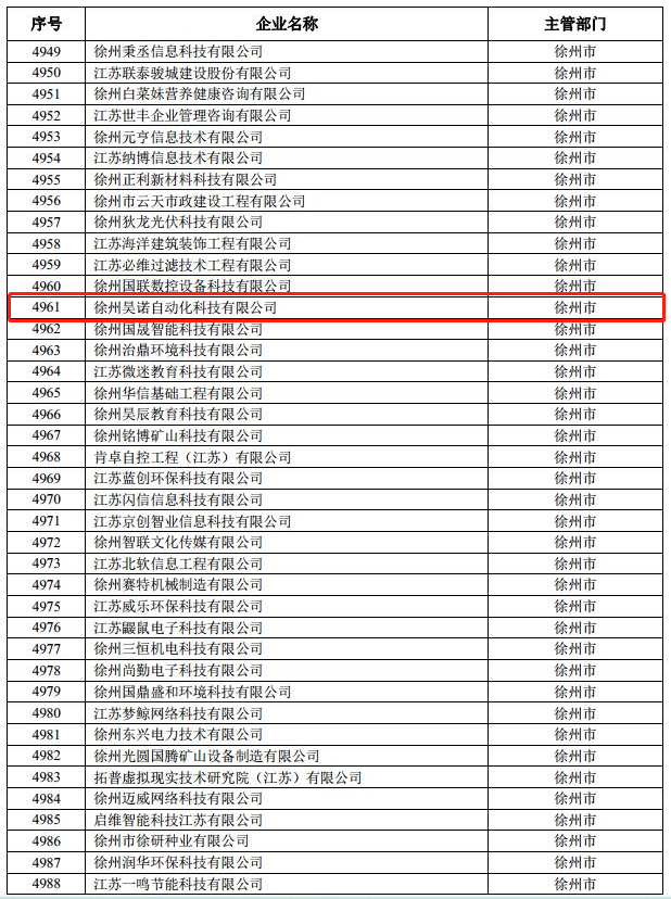 根據(jù)江蘇省科學技術(shù)廳、江蘇省財政廳關(guān)于公布江蘇省高新技術(shù)企業(yè)培育庫2020粘度入庫企業(yè)名單的通知,為貫徹落實省政府引發(fā)的《江蘇省推進高新技術(shù)企業(yè)高質(zhì)量發(fā)展的若干政策》,深入實施高新技術(shù)企業(yè)培育“小升高”行動計劃,進一步加強高新技術(shù)企業(yè)培育,經(jīng)企業(yè)申報、專家評審、網(wǎng)上公示、地方審查推薦等程序,確定了15148家企業(yè)作為省高新技術(shù)企業(yè)培育庫2020年度入庫企業(yè)。根據(jù)通知附件《江蘇省高新技術(shù)企業(yè)培育庫2020年度入庫企業(yè)名單》,4961號為徐州昊諾自動化科技有限公司。